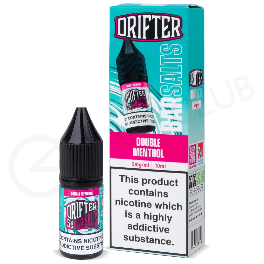 Double Menthol nic salt e-liquid by Drifter Bar Salts pairs two cool, crisp notes. Chilly menthol to start is met with an arctic rush of ice.