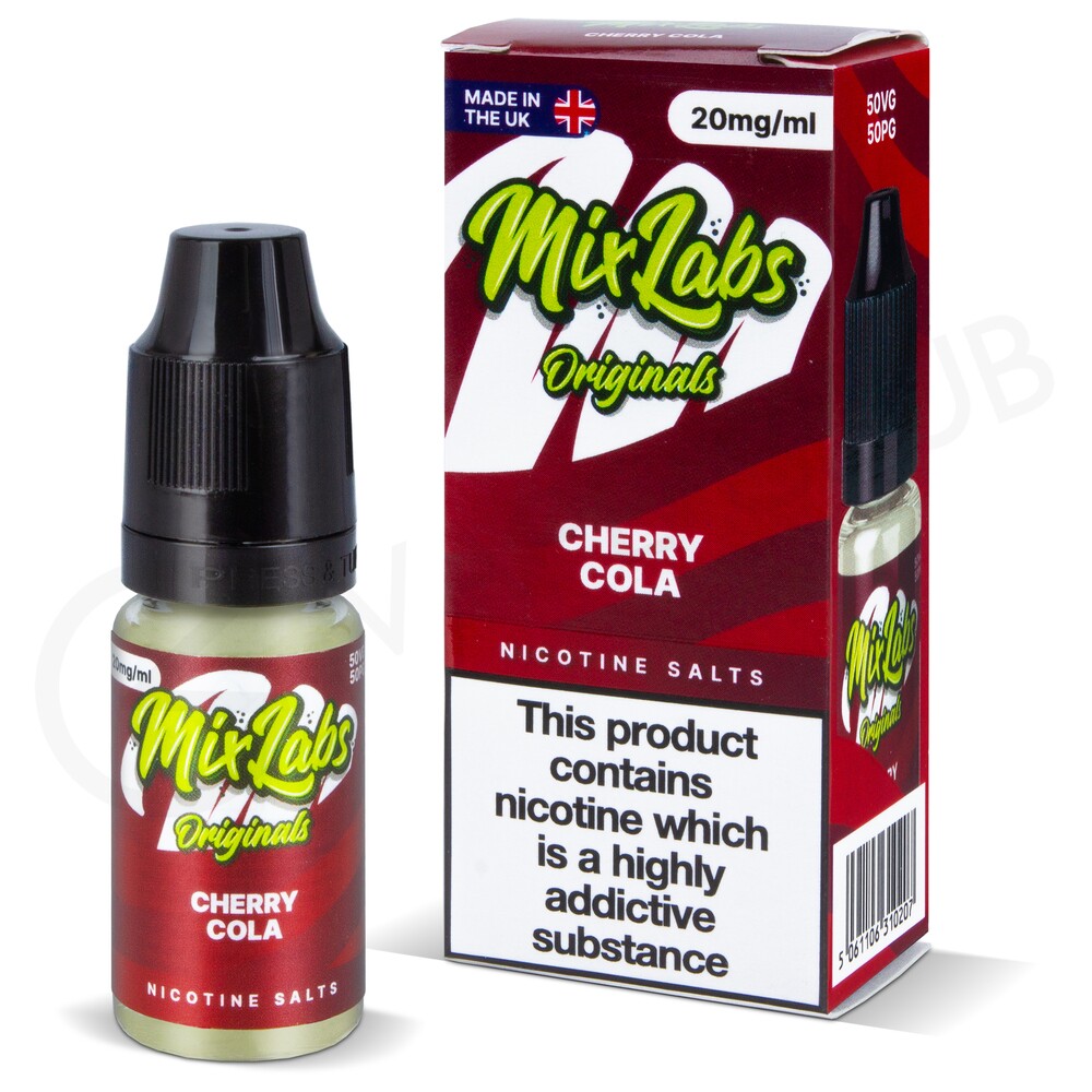 The Cherry Cola nic salt e-liquid by Mix Labs contains salt nicotine, which will provide a smooth throat hit whilst satisfying cravings quickly. This e-liquid is available in 5mg, 10mg and 20mg strengths.