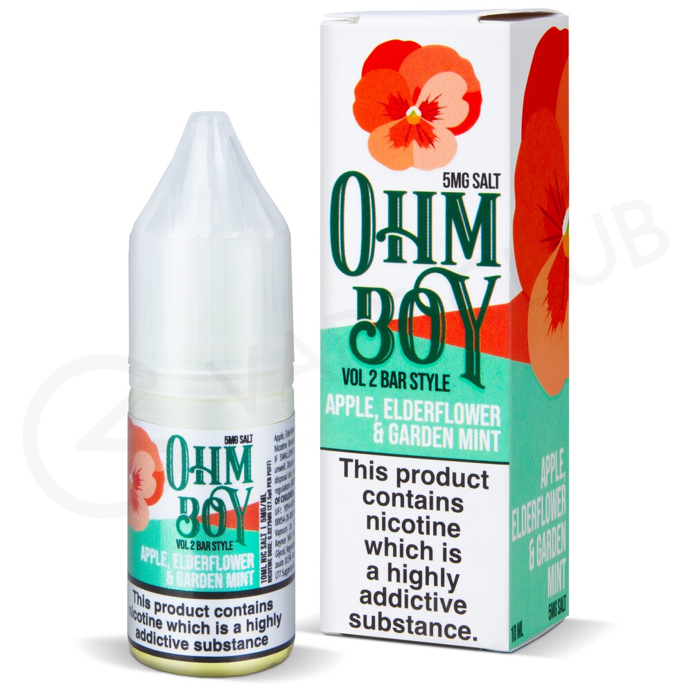 Apple, Elderflower & Garden Mint nic salt e-liquid by Ohm Boy Bar Style combines the sweet taste of red apple with fragrant notes of elderflower on inhale, before being chilled by a cool mint exhale.