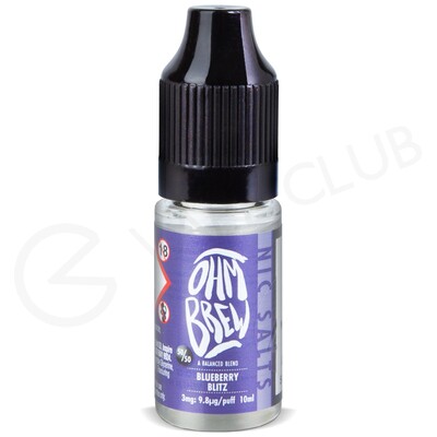 Blueberry Blitz nicotine salt e-liquid by Ohm Brew Nic Salts is a simple fruit with a bold taste. The sharp yet sweet blueberry flavour is present from inhale to exhale for a distinct vape.