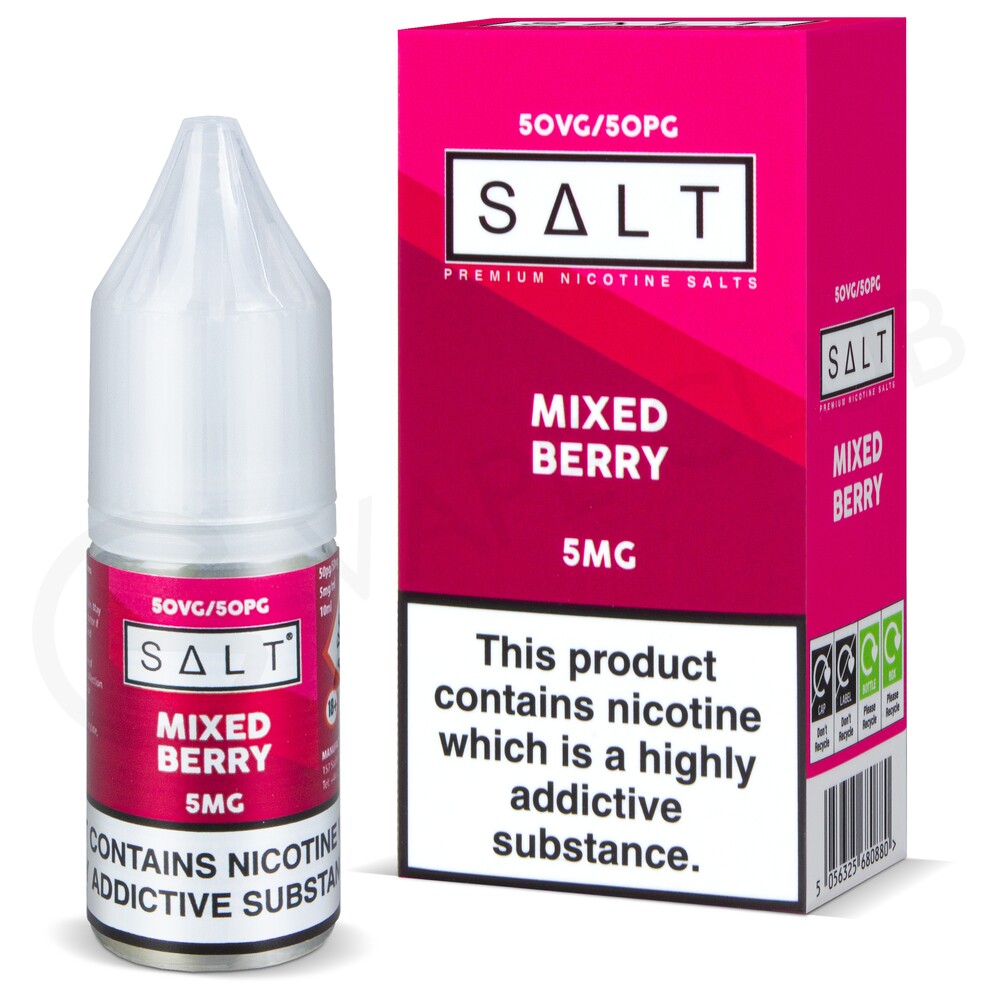 Mixed Berry nicotine salt e-liquid by Salt captures the taste of a juicy berry medley. Sweet notes of blackcurrant on inhale are countered by the tangy zest of raspberry on exhale for a balanced, all-day vape.