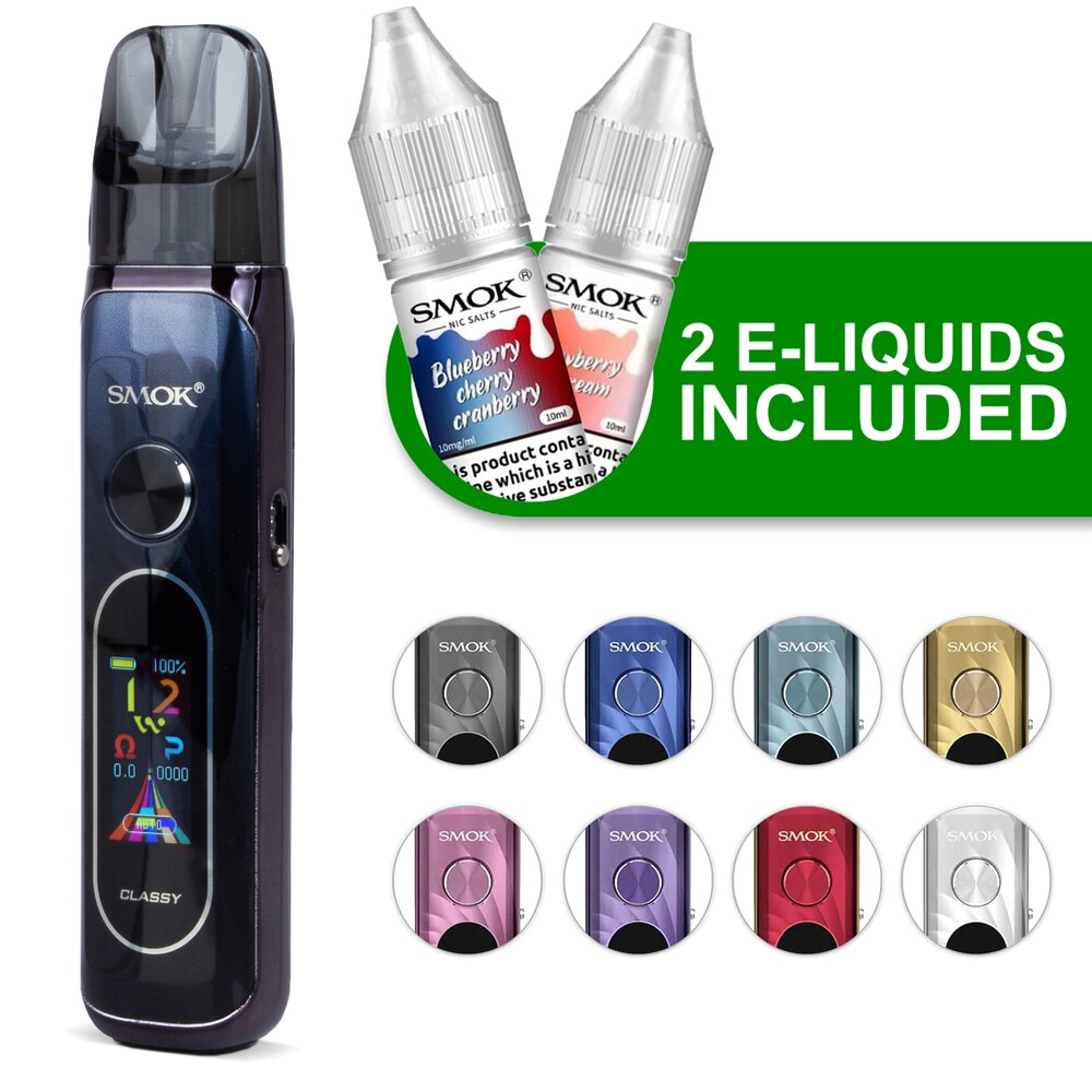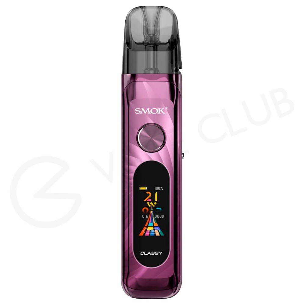 The Novo Classy device is compatible with all Smok Novo CLX (side-filling) and SLR (top-filling) pods, and these pods don’t need to be removed from the device to fill them. Both the CLX and SLR pods come in 0.6 Ohm and 0.8 Ohm resistances. The 0.8 Ohm pods can be used for MTL vaping, creating a small amount of vapour with an inhale that feels similar to a cigarette. The 0.6 Ohm pods are designed for RDTL (Restricted Direct To Lung) vaping. We recommend that you use 50% VG e-liquid with all of these pods.