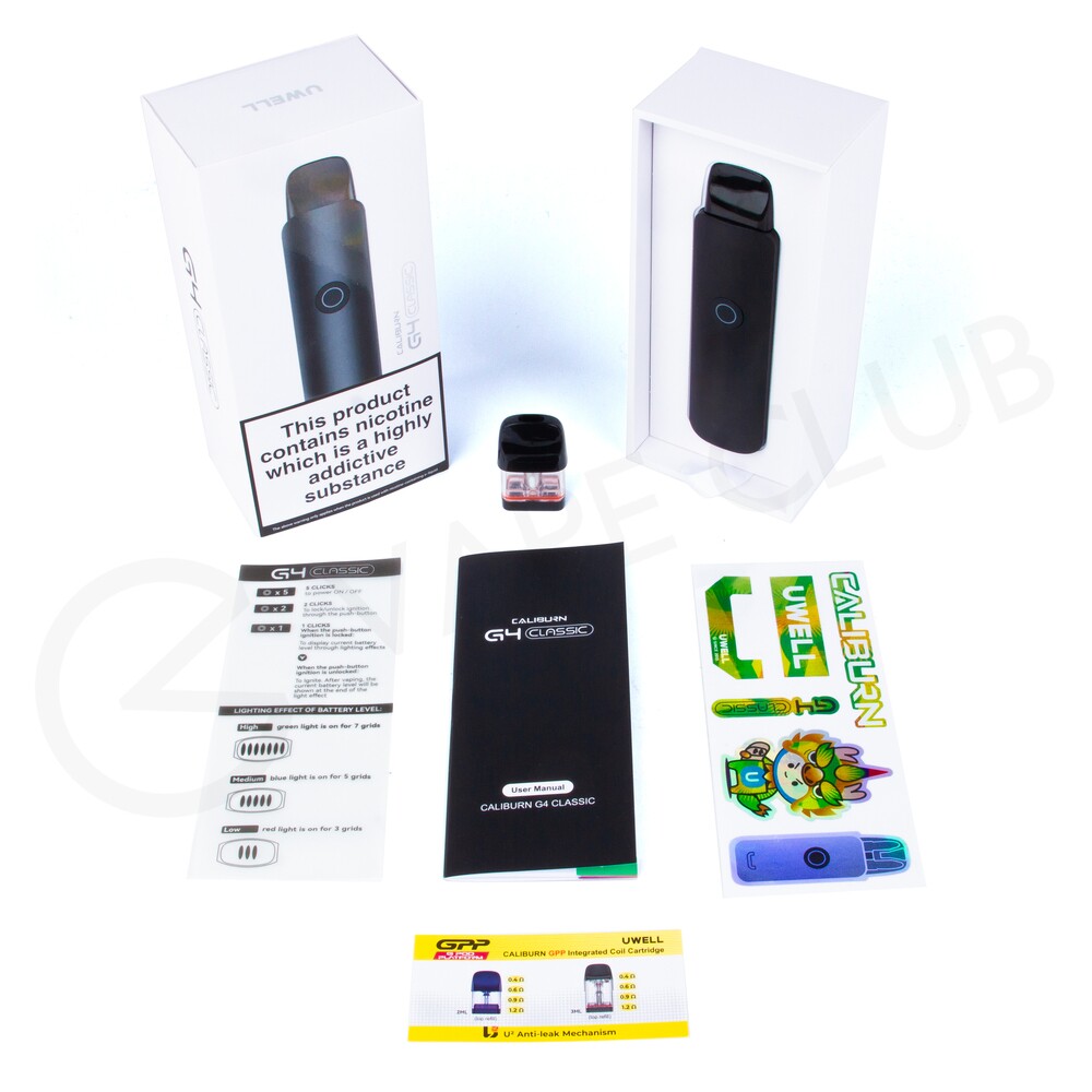 (29 Aug 2025)The Caliburn G4 Classic pod kit can be used with the full range of Caliburn G3 replacement pods, with resistances ranging from 0.4 Ohm to 1.2 Ohm.
