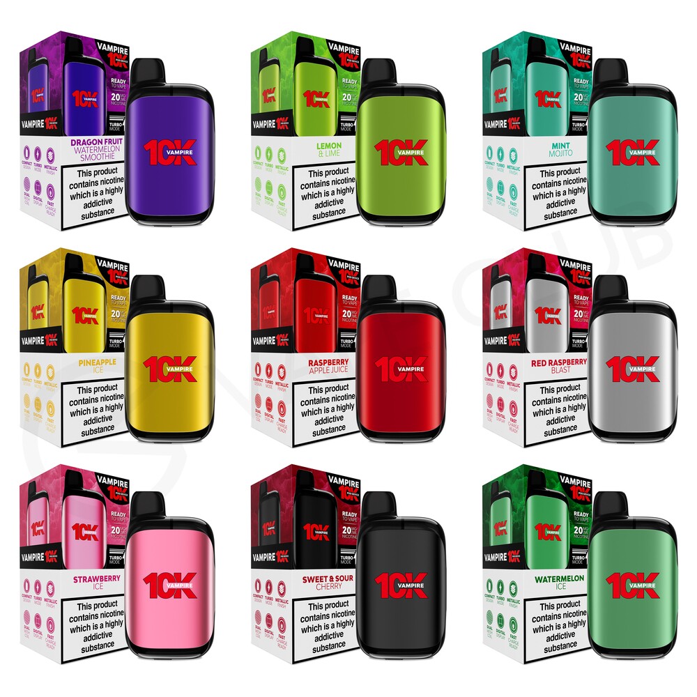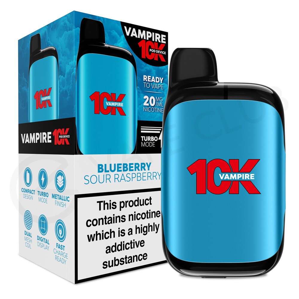 The Vampire Vape 10K kit is a simple and compact big puff vape. It features a built-in 950mAh battery that should last a whole day between charges. The kit includes a 2ml prefilled pod and a 10ml refill container, for a total of 12ml of e-liquid. You can expect up to 10,000 puffs out of the box, and when both the pod and container are empty, just replace them with a new Vampire Vape 10k refill pack.