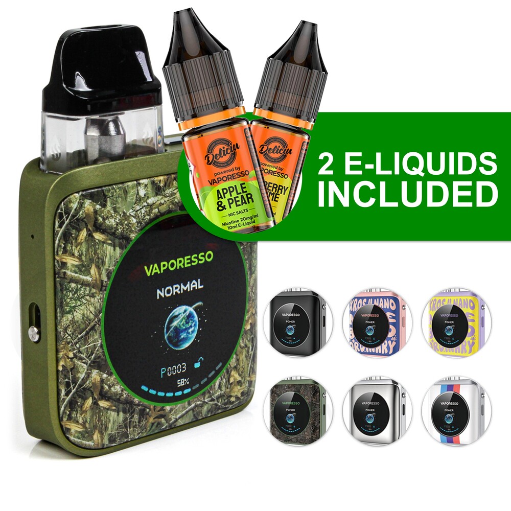 The Vaporesso Xros 4 Nano vape kit is an easy-to-use yet versatile option. An upgraded version of the Xros 3 Nano, and a smaller alternative to the Xros Pro, this pocket-friendly kit features a built-in 1350mAh battery that’s big enough to last most vapers all day. The 15 - 30W output range supports both MTL (Mouth To Lung) and RDTL (Restricted Direct To Lung) vaping, so it’s easy to switch up your inhale style. Two Xros pods and a bottle of Deliciu e-liquid are included, so you’ll have everything you need to get started!