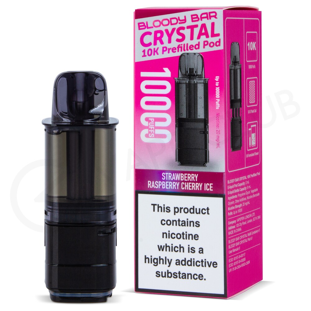 Bloody Bar Crystal refill packs are designed to be used with the Bloody Bar Crystal 10K vape kit. Each pack contains a prefilled 2ml pod that houses a 0.8 Ohm mesh coil, along with a 8ml refill container, that are both replaceable. When assembled and paired with your device, they'll deliver up to 10,000 puffs. You can expect a smaller amount of vapour which is slightly more airy, mimicking a cigarette-like MTL (Mouth To Lung) inhale.
