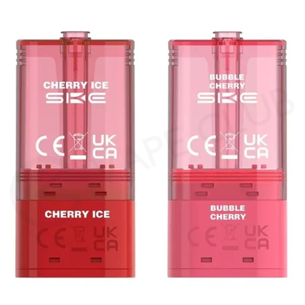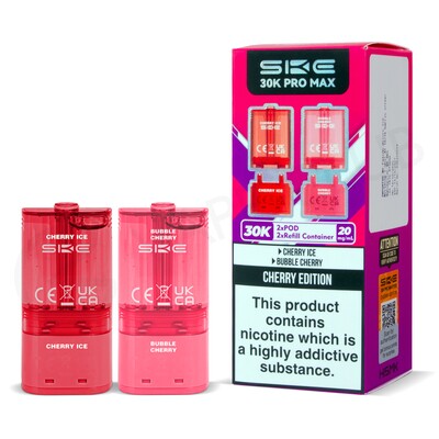 Cherry Edition SKE 30K Pro Max pods are compatible with the SKE 30K Pro Max big puff vape. Each refill pack edition comprises two different flavours. The pack contains two 1.8ml prefilled pods featuring mesh coils for boosted flavour, and two 8.2ml refill containers, for a total of 22ml of nic salt e-liquid. Combined, they will deliver up to 30,000 puffs. These refill packs are designed for MTL (Mouth To Lung) vaping, creating a small amount of vapour with an inhale that feels similar to a cigarette.