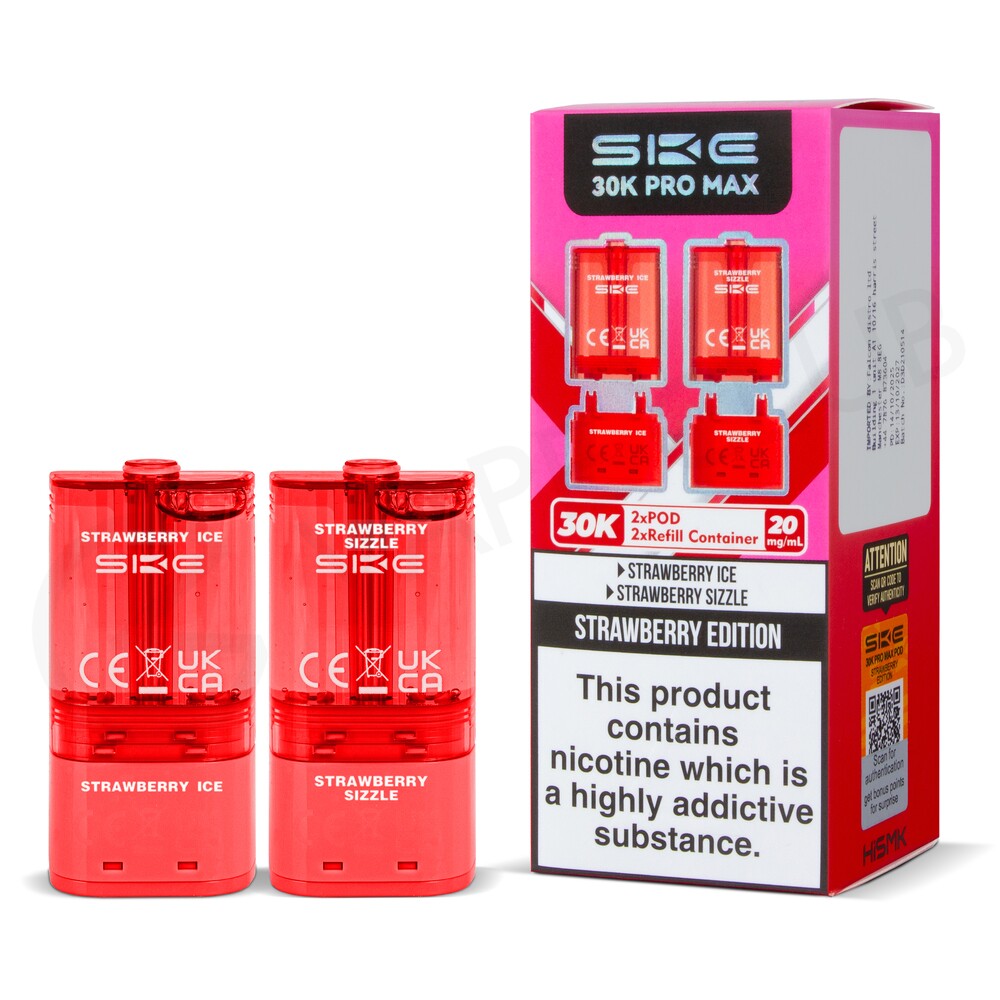 Strawberry Edition SKE 30K Pro Max pods are compatible with the SKE 30K Pro Max big puff vape. Each refill pack edition comprises two different flavours. The pack contains two 1.8ml prefilled pods featuring mesh coils for boosted flavour, and two 8.2ml refill containers, for a total of 22ml of nic salt e-liquid. Combined, they will deliver up to 30,000 puffs. These refill packs are designed for MTL (Mouth To Lung) vaping, creating a small amount of vapour with an inhale that feels similar to a cigarette.
