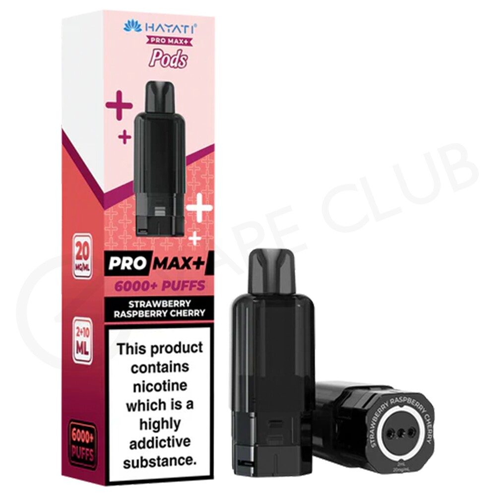 Strawberry Raspberry Cherry Hayati Pro Max Plus pods fuse the sweet flavour of strawberry with notes of tart raspberry and tangy cherry for a balanced blend.
