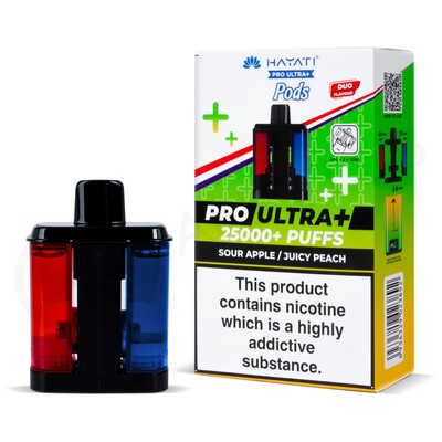 The Sour Apple & Juicy Peach Hayati Pro Ultra Plus refill packs are compatible with the Hayati Ultra Pro Plus big puff kit. These refill packs feature two 2ml prefilled pods and 10ml refill containers in two different flavours that, when combined, can provide up to 25,000 puffs before running out. The will produce a small amount of vapour for an MTL (Mouth To Lung) inhale.