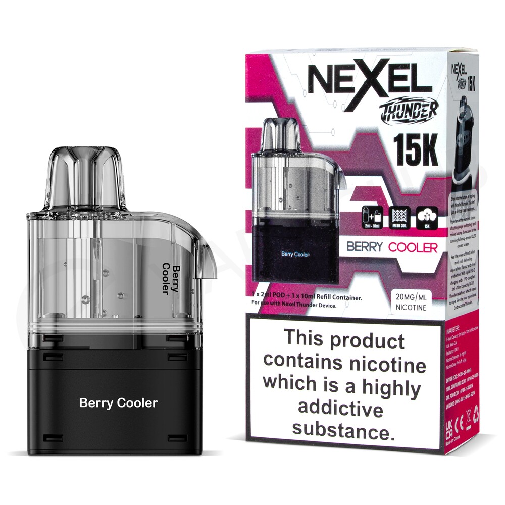 The Berry Cooler Nexel Thunder 15K refill pack is designed to be used with the Nexel Thunder 15K. Each refill pack consists of a 2ml prefilled pod and 10ml refill container that together deliver up to 15000 puffs before needing to be replaced. Prefilled with 20mg nic salt e-liquid, these pods deliver a smooth throat hit and an authentic MTL (Mouth To Lung) inhale when paired with your device.