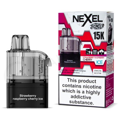 The Strawberry Raspberry Cherry Ice Nexel Thunder 15K refill pack is designed to be used with the Nexel Thunder 15K. Each refill pack consists of a 2ml prefilled pod and 10ml refill container that together deliver up to 15000 puffs before needing to be replaced. Prefilled with 20mg nic salt e-liquid, these pods deliver a smooth throat hit and an authentic MTL (Mouth To Lung) inhale when paired with your device.