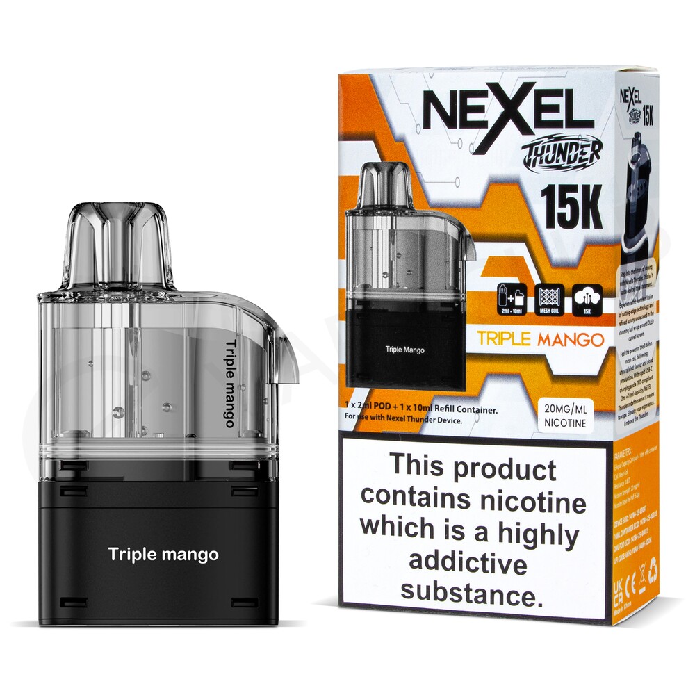 The Triple Mango Nexel Thunder 15K refill pack is designed to be used with the Nexel Thunder 15K. Each refill pack consists of a 2ml prefilled pod and 10ml refill container that together deliver up to 15000 puffs before needing to be replaced. Prefilled with 20mg nic salt e-liquid, these pods deliver a smooth throat hit and an authentic MTL (Mouth To Lung) inhale when paired with your device.