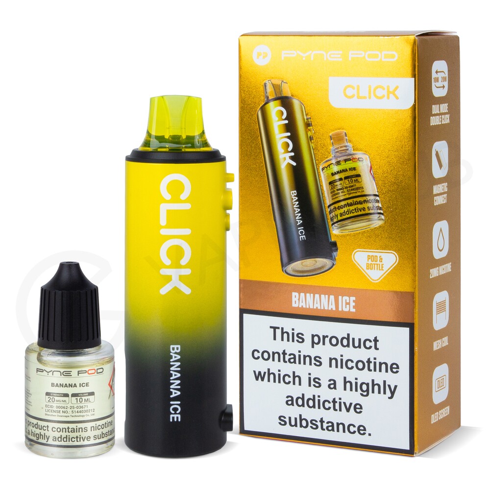 The Banana Ice Pyne Pod Click refill pack is compatible with the Click 10K, Click 50K and Click S 30K pod vape kits. It is made up of a 2ml prefilled pod and 10ml refill container that, when assembled, can provide up to 10,000 puffs. It will produce a small amount of vapour, making it ideal for MTL (Mouth To Lung) vaping, and can be swapped out for a new pack easily once it’s empty.