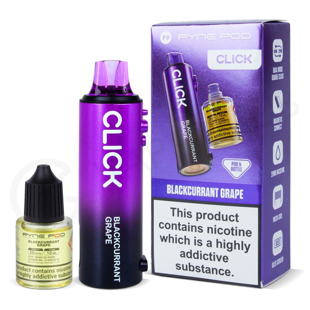 The Blackcurrant Grape Pyne Pod Click refill pack is compatible with the Click 10K, Click 50K and Click S 30K pod vape kits. It is made up of a 2ml prefilled pod and 10ml refill container that, when assembled, can provide up to 10,000 puffs. It will produce a small amount of vapour, making it ideal for MTL (Mouth To Lung) vaping, and can be swapped out for a new pack easily once it’s empty.
