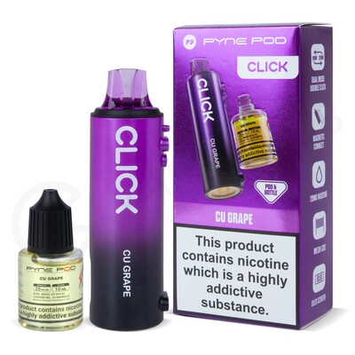 Compatible with the Click 10K, Click 50K and Click S 30K vape kits, the CU Grape Pyne Pod click refill pack includes a 2ml prefilled pod and a 10ml refill container that together can deliver up to 10,000 puffs. Designed for MTL (Mouth To Lung) vaping, it will create a discreet amount of vapour and can be easily replaced when it’s time to swap out for a new one.