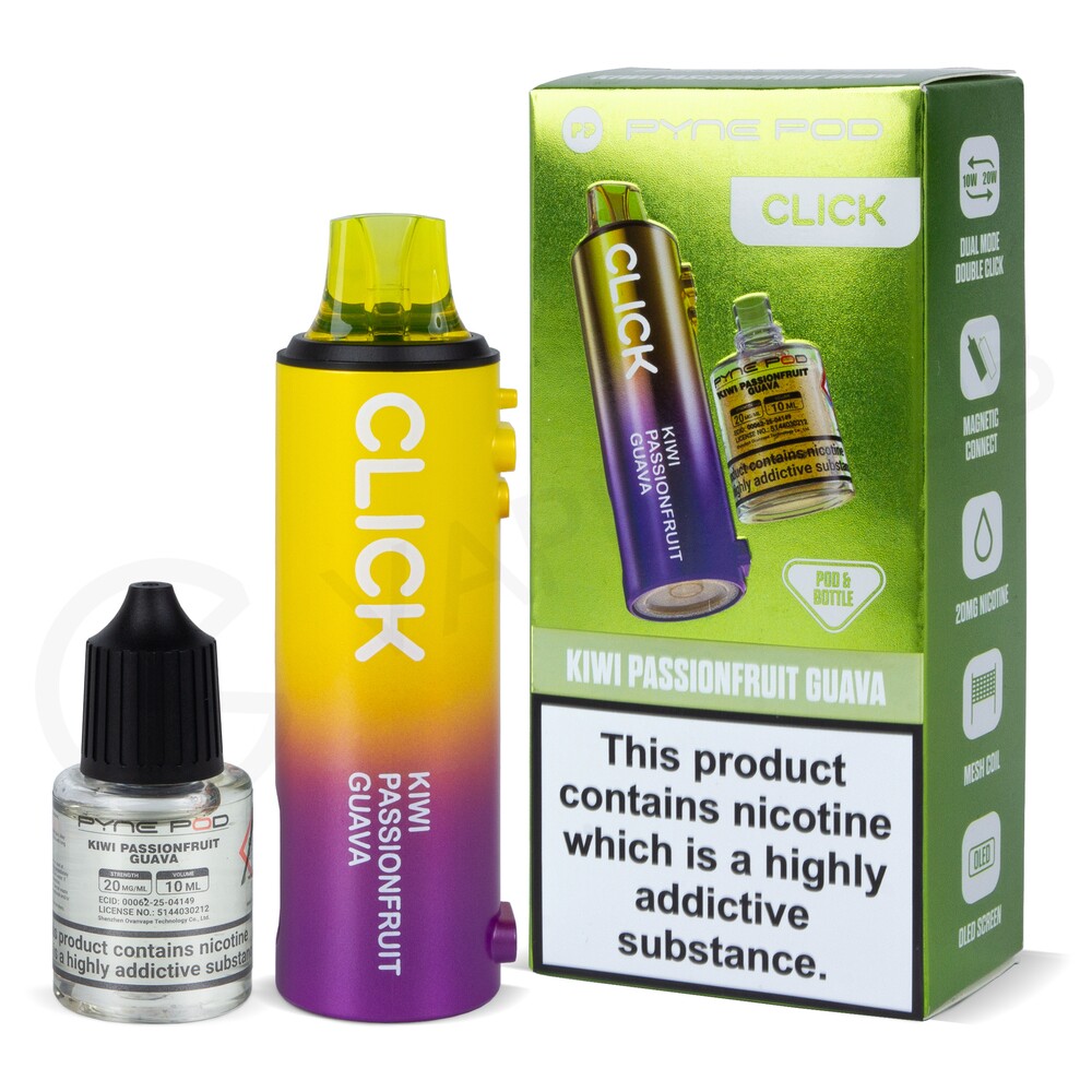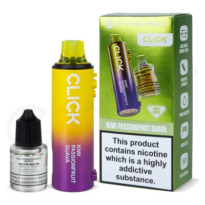 The Kiwi Passionfruit Guava refill pack is designed for the Click 10K, Click 50K and Click S 30K pod vape kits. It features a 2ml prefilled pod and a 10ml refill container that combine to offer up to 10,000 puffs before running out. Suitable for MTL (Mouth To Lung) vaping, it will produce a discreet amount of vapour, and can be easily replaced once it runs out.