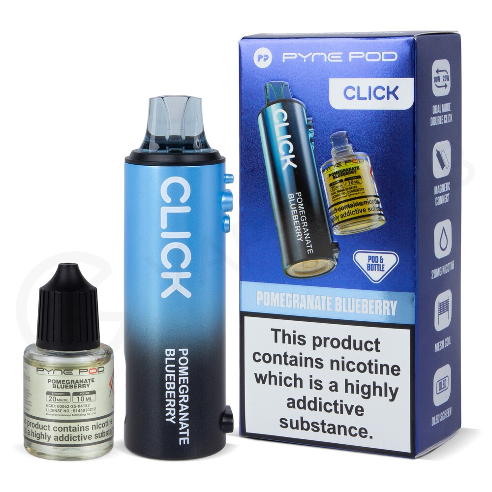 Designed for use with the Click 10K, Click 50K and Click S 30K pod vape kits, Pomegranate Blueberry refill packs are made up of a 2ml prefilled pod and 10ml refill container that when combined are able to deliver up to 10,000 puffs. Producing a small amount of vapour, they are ideal for MTL (Mouth To Lung) vaping.