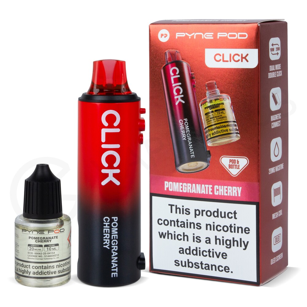 Designed for use with the Click 10K, Click 50K and Click S 30K pod vape kits, Pomegranate Cherry refill packs are made up of a 2ml prefilled pod and 10ml refill container that when combined are able to deliver up to 10,000 puffs. Producing a small amount of vapour, they are ideal for MTL (Mouth To Lung) vaping.