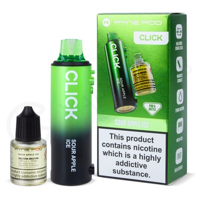 Compatible with the Click 10K, Click 50K and Click S 30K vape kits, the Sour Apple Ice Pyne Pod click refill pack includes a 2ml prefilled pod and a 10ml refill container that together can deliver up to 10,000 puffs. Designed for MTL (Mouth To Lung) vaping, it will create a discreet amount of vapour and can be easily replaced when it’s time to swap out for a new one.