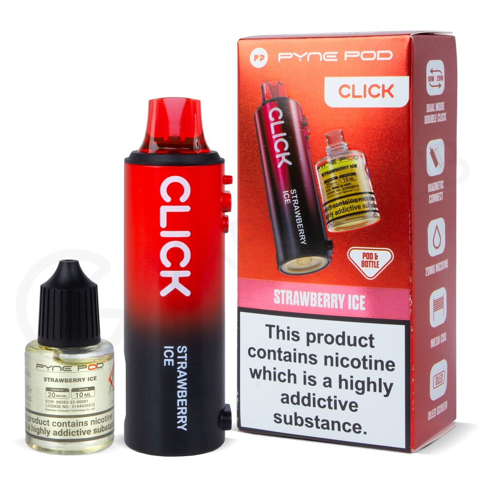 Compatible with the Click 10K, Click 50K and Click S 30K vape kits, the Strawberry Ice Pyne Pod click refill pack includes a 2ml prefilled pod and a 10ml refill container that together can deliver up to 10,000 puffs. Designed for MTL (Mouth To Lung) vaping, it will create a discreet amount of vapour and can be easily replaced when it’s time to swap out for a new one.