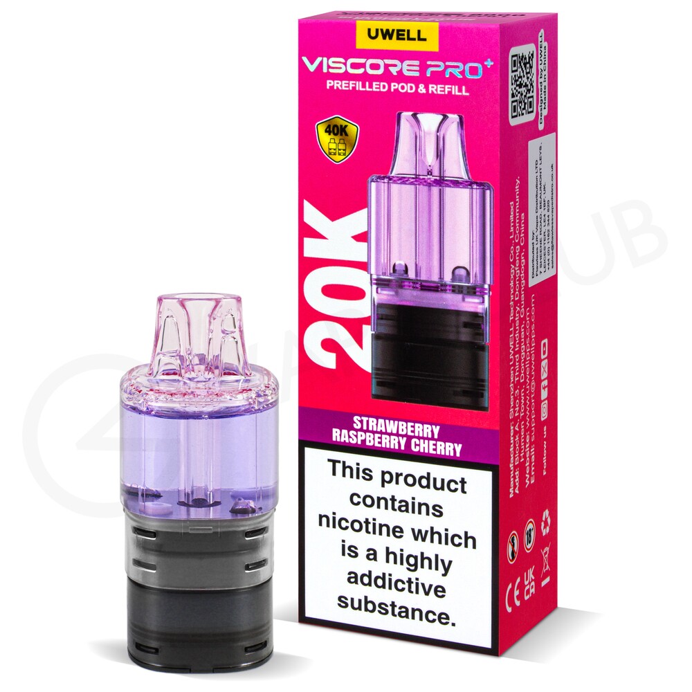 Strawberry Raspberry Cherry Viscore Pro Plus refill pods are designed to be used with the Uwell Viscore Pro Plus and Viscore 8000 big puff vape kits. Each pack contains a prefilled 2ml pod and a 10ml prefilled container, for a total of 12ml of 20mg e-liquid. The pods contain a built-in 0.8 Ohm mesh coil, designed for MTL (Mouth To Lung) vaping. They’ll create discreet amounts of vapour, similar to a cigarette.